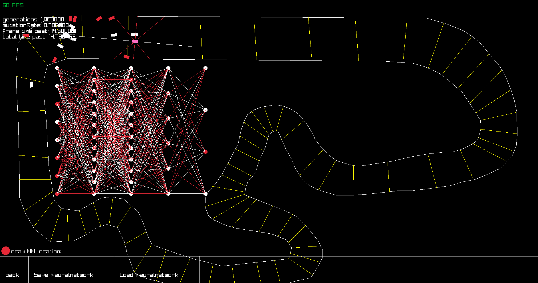 For this project I made an progam in which a car learns itself to drive. I used the programming language c++ and made an makefile to compile the code. The file structure used in the program and the way the makefile are used aren't good. I created the code for 2 types of ai: neuralnetworks and Qtables. I made 2 different update algorithms for the AI that uses neuralnetworks, these update algorithms are: genetic and backpropagation. The genetic AI works good, but the AI using backpropagation doesn't mlearn correctly, because I couldn't create an good learning algorithm. The program works, but there are probably some small errors that can occur.